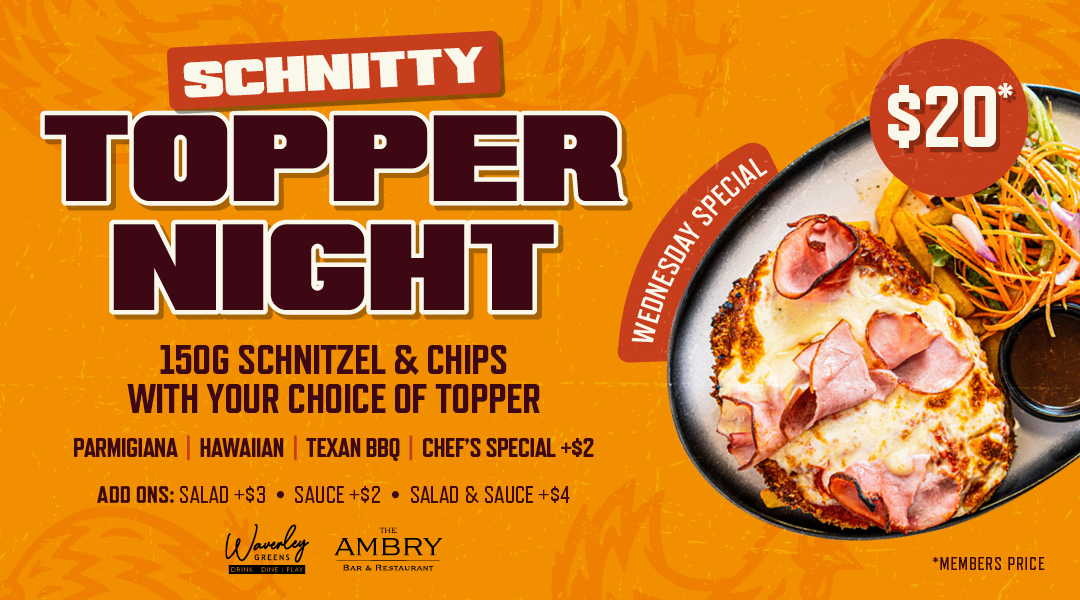 Join us every Wednesday night for Schnitty Topper Night. For just $20*, you'll get your hands on a 150g schnitzel and chips with your choice of topper. Choose between: Parmigiana... Read more »